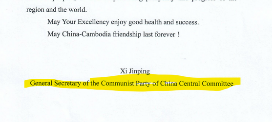 根據2018年習近平向柬埔寨王國發出的官方書函,習近平只代表中國共產黨黨總書記,並沒有用中國國家主席身份致函。
