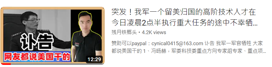 這個《残月铁榔头》頻道有許多虛假視頻。我剛剛發現到這個《我军一个留美归国的高阶技术人》視頻也是偽虛冒的。他們就立刻把這個頻道的頻道歷史搜索功能修改!
