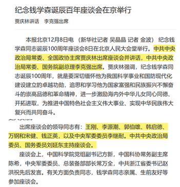 但是到了2021年,“紀念錢學森同志誕辰110周年座談會”衹是由中國科協主辦,沒有中央高層出席。這當然是和《習近平總書記》奪回政治權有密切關係。