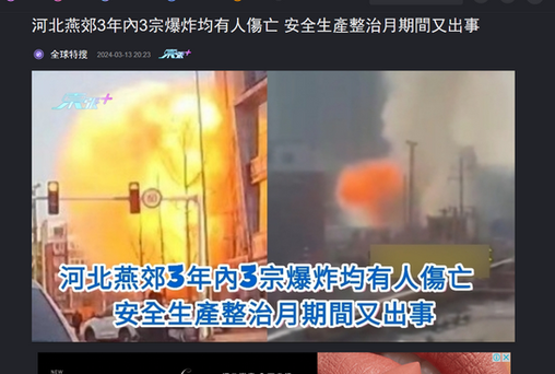 其實河北燕郊3年內3宗爆炸均有人傷亡。在2022年6月24日。河北燕郊商鋪大爆炸也導致兩人死亡。那間商鋪的破壞程度和3月13日的那一宗十分相似。