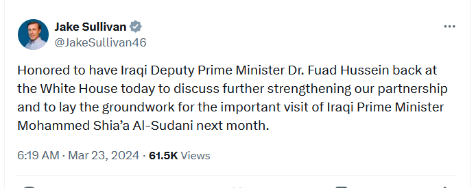 事實上沙利文在3月22日在華盛頓會見了伊拉克外交部長福阿德·侯賽因。然後3月26日布林肯才跟著會見侯賽因。