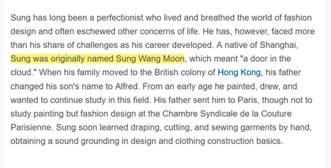 加拿大的时装大王是Alfred Sung,是撒旦龜婆沈殿霞的弟弟。他的姓氏英文串法是“Sung", 根據香港政府的粵語拼音是姓《宋》的。撒旦龜婆沈殿霞一家人想掩人耳目,欺騙世人,自稱自己姓《沈》。