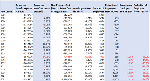 而且銷售成本十年來變化不大,他們在2015年也裁掉20%員工(1052人),員工福利支出減少15%。而且非版權銷售成本(Non-Program Cost = Cost of Sales - Cost of Programs) 減少33%,很明顯都是削減那些沒有固定工作的合約演員。
