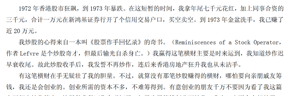 根據《我是黎智英》一書,1972 年香港股市狂飙,到 1973 年暴跌。在这短暂的时间,我拿年尾七千元花红,加上同事合资的三千元,合计一万元在新鸿基证券行开了个信用交易户口,买空卖空。到 1973 年金盆洗手,我已赚了近 20 万元。