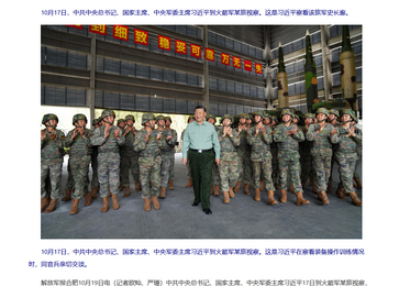 根據中國國防部的官方網站,10月17日,中共中央總書記、國家主席、中央軍委主席習近平到火箭軍某旅視察。這是習近平察看該旅軍史長廊。