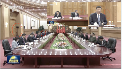 图3:坐在习近平身边的王毅,身后的大门处的三角架也没了。从视频大约32秒到大约52秒处,镜头扫过了习近平右边的六名中共官员,可以看到,两扇大门的右角,都没有那个开场镜头中的那个三角架。
