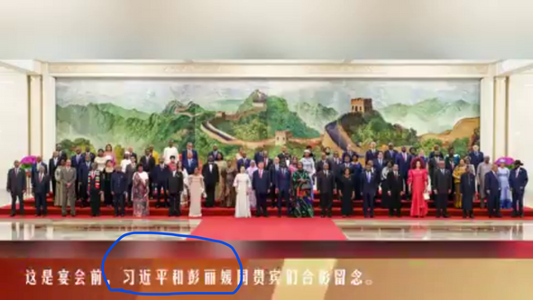外交官員用字是十分嚴謹的,和外國政要交往是講求對等原則的。正規的官方用詞應該是《國家主席習近平和夫人彭麗媛塞内加尔总统法耶和夫人合影留念》。