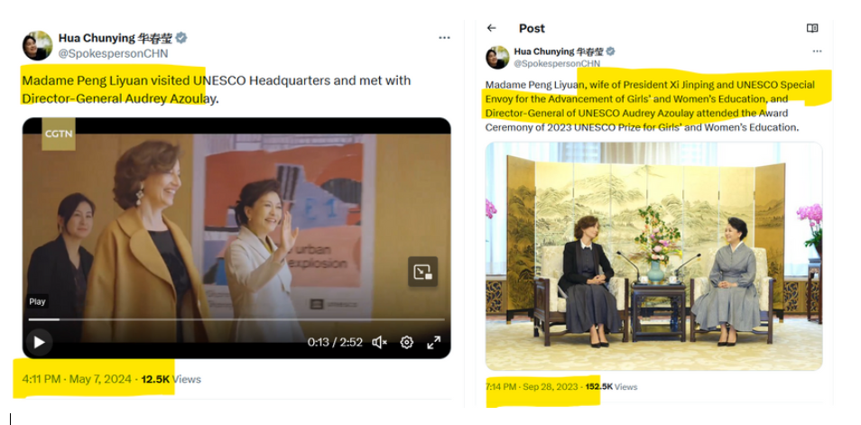 華春瑩發佈的視頻內衹是稱呼大淫婦彭麗媛為 " the wife of Chinese President Xi Jinping",並沒有提及她是UNESCO Special Envoy for Girls’ and Women’s Education。