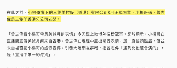 直播帶貨界頂級網紅「瘋狂小楊哥」,旗下的三隻羊集團香港分公司今日(21日)舉行開幕禮,無綫電視(TVB)總經理曾志偉作為香港分公司的老闆當然要出席,於是同日現身中年業績報告發布會後便立即趕到開幕禮。現場更有過百藝人出席開幕禮,亦有大批內地網紅出現。