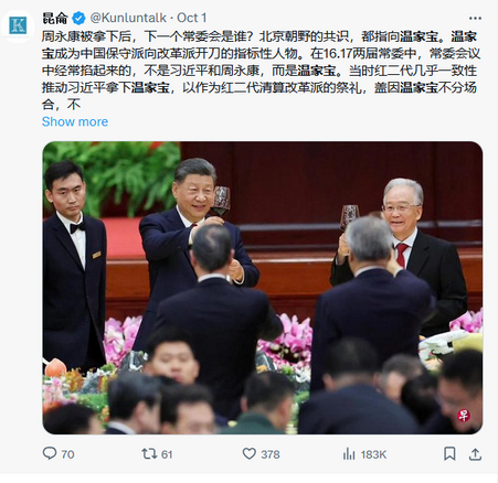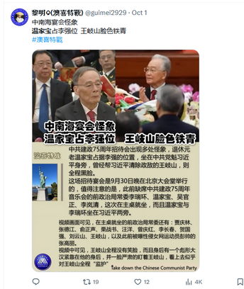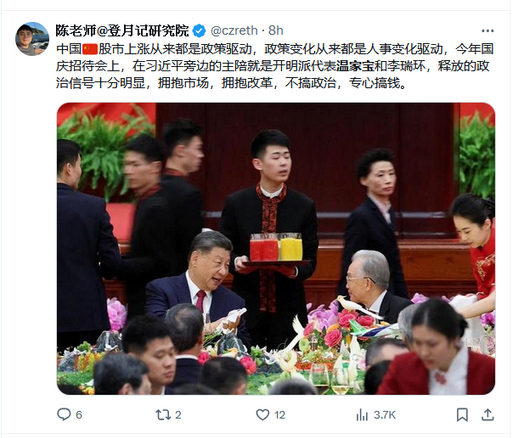 出席75週年國慶招待會的是《席近平》主席,作為現屆的領導人和前任總理溫家寶當然要出席。撒旦網軍不斷炒作《席近平》主席和溫家寶的輕鬆談笑畫面,這很明顯就是一個政治作秀。《席近平》主席想告訴大家他還有溫家寶做後盾。可惜溫家寶並沒有出席75週年音樂會。