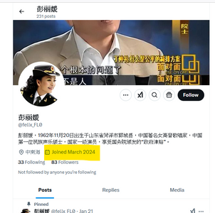 大淫婦彭麗媛為了否定她之前在推特的言論,所以2024年在推特上建立新賬戶來混淆視線。
