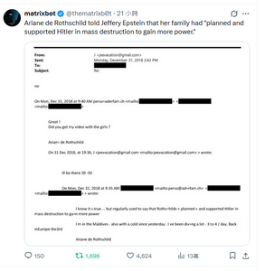 Ariane de Rothschild told Jeffery Epstein that her family had "planned and supported Hitler in mass destruction to gain more power."