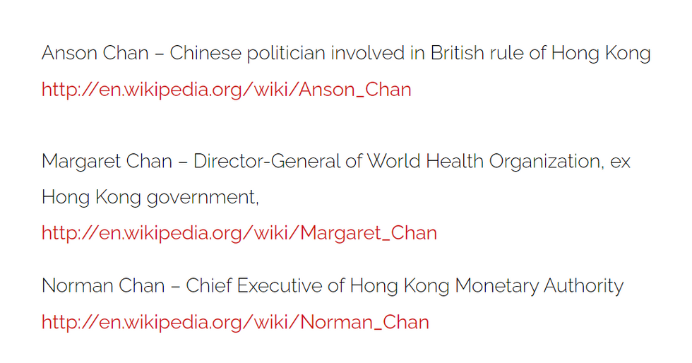 Anson Chan, Margaret Chan, and Norman Chan from Hong Kong were on the 2010 Committee 300 list along with Bill Gates, Warren Buffett, and Queen Elizabeth. This explains why Anson Chan was so active in the democratic movement. Hong Kong was controlled by the Illuminati for sure.