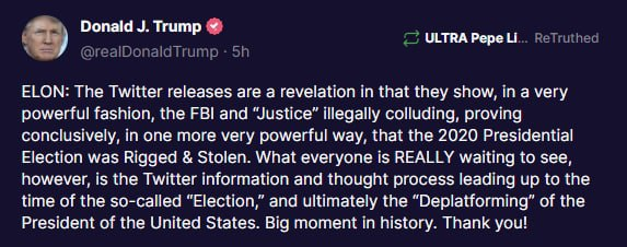 "ELON: The Twitter releases are a revelation in that they show, in a very powerful fashion, the FBI and “Justice” illegally colluding, proving conclusively, in one more very powerful way, that the 2020 Presidential Election was Rigged & Stolen. What everyone is REALLY waiting to see, however, is the Twitter information and thought process leading up to the time of the so-called “Election,” and ultimately the “Deplatforming” of the President of the United States. Big moment in history. Thank you!"