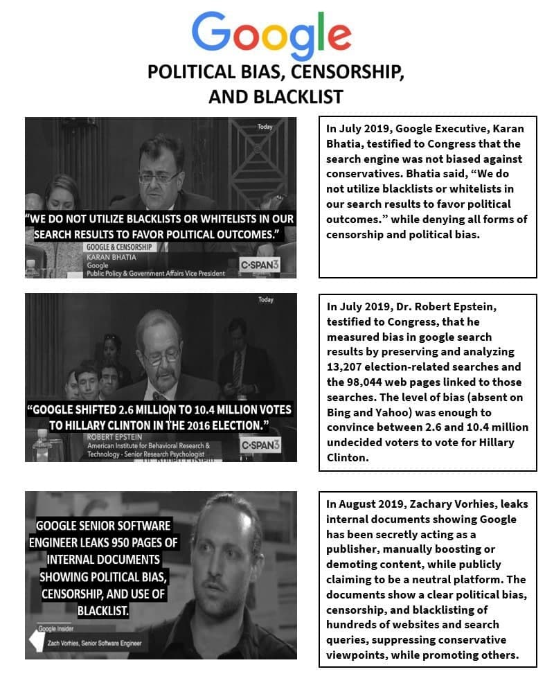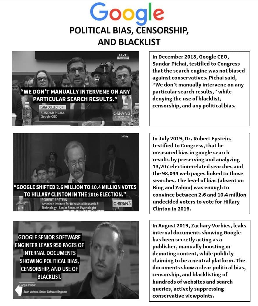 Google's CEO, Sundar Pichai, & Google's Vice President, Karan Bhatia, had previously testified to Congress that the search engine wasn't "manually intervening" or "utilizing blacklist" in search results.