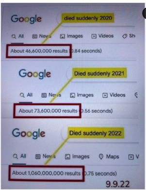 Some people such as Stew Peters reported about the Google search results of "died suddenly" figures have increased dramatically. Google immediately altered the data afterward.