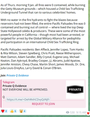 As of Thurs. morning 9 Jan. all fires were 0 contained, while burning the Getty Museum grounds – which housed a Child Sex Trafficking Underground Tunnel that ran to various celebrities’ homes.