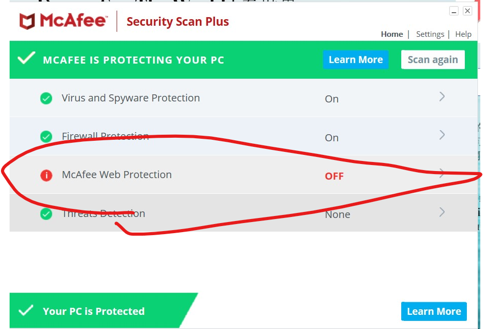 When I started my PC, popped up a warning with the McAfee WebProtection "OFF" screen and asked me to download a new software kit.