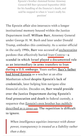 Jeffrey Epstein paid a key role in Iran-Contra, sheltering funds for the CIA's illicit arms dealer. In that one operation alone, you have the CIA in the US, Israeli intelligence, UK intelligence and Saudi intelligence."