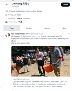 秦剛的推特賬號被驗證為“灰色徽章”,即政府官方賬號。他的頭銜是第11任中國駐美國大使,並不是中國外交部部長。最後一次更新是1月5日。