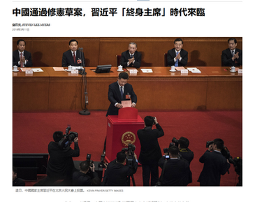2018年,中國通過修憲草案,習近平「終身主席」時代來臨