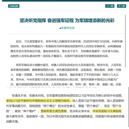 苗華領導下的中央軍委政治工作部8月1日在《求是》雜誌發表文章,表面是向黨中央效忠。其實真正的意思是強調自己衹是聽命於中央軍委和《席近平》主席指揮,要貫徹軍委主席負責制,不要找他們做代罪羔羊!同樣解放北軍日報也有相同類似文章。