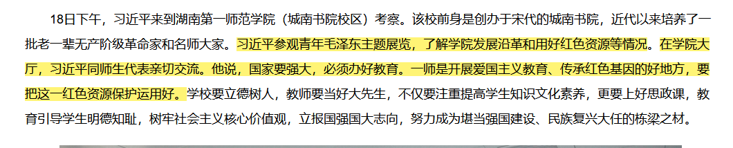 18日下午,习近平来到湖南第一师范学院(城南书院校区)考察。该校前身是创办于宋代的城南书院,近代以来培养了一批老一辈无产阶级革命家和名师大家。习近平参观青年毛泽东主题展览,了解学院发展沿革和用好红色资源等情况。在学院大厅,习近平同师生代表亲切交流。他说,国家要强大,必须办好教育。一师是开展爱国主义教育、传承红色基因的好地方,要把这一红色资源保护运用好。学校要立德树人,教师要当好大先生,不仅要注重提高学生知识文化素养,更要上好思政课,教育引导学生明德知耻,树牢社会主义核心价值观,立报国强国大志向,努力成为堪当强国建设、民族复兴大任的栋梁之材。