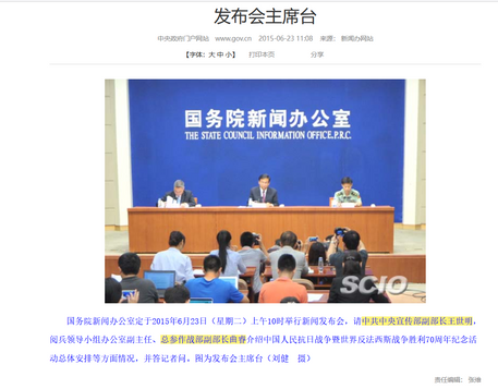 新华社北京6月23日电(记者 罗宇凡)23日上午,国务院新闻办公室举行新闻发布会,中宣部副部长王世明,阅兵领导小组办公室副主任、总参作战部副部长曲睿介绍了中国人民抗日战争暨世界反法西斯战争胜利70周年纪念活动总体安排等方面情况。