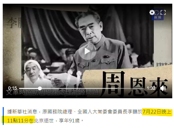 李鵬在2019年7月22日晚上11點11分逝世。這個日子也很講究 !