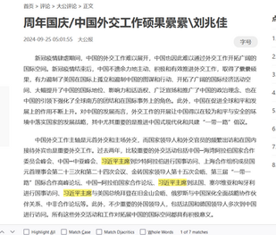 前一陣子,劉兆佳歌頌國家主席《席近平》是一位崇高威望,新時代中國特色社會主義習近平思想,亦得到全國人民擁戴。他在2024年9月25日,三中全會之後,發佈一篇文章歌頌《席近平》主席的外交成績!