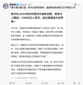 但是Twitter X 平臺有人發佈:《新華社報導2024年中國對外援助總額,更是令人矚目,12880億人民幣》。首先我在新華網找不到相關文章,但是在百度的AI有相同的答案。