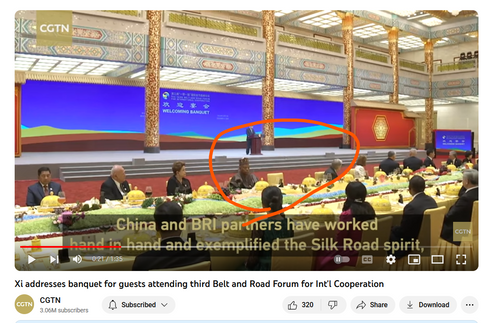 而且從一帶一路的歡迎晚宴視頻內,習近平的空位旁邊不是大淫婦彭麗媛,是兩位男性。這和成都大運會歡迎宴會,大淫婦彭麗媛在演講臺下正中不一樣。