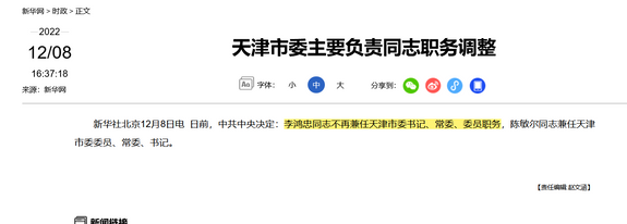 李鴻忠在2016年,擔任中共天津委書記。天津在新冠疫情期間多次失控爆發災難。2022年12月8日,李鴻忠被免除天津委書記,常委和委員職務。