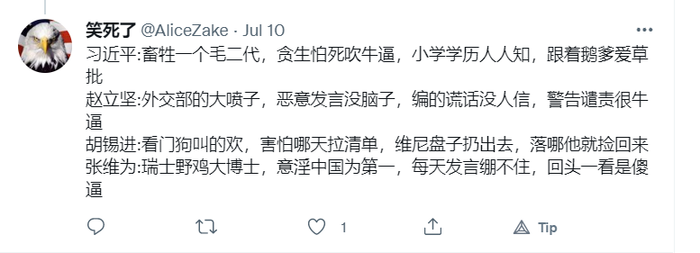從她的貼文,他的文化水平極之低下,否定道德教育。身為第一夫人用《支那人》來形容自己中國人。而且她不斷咀咒習近平患病死亡。