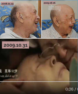 互聯網上有兩張錢學森老年在醫院的照片,他的面上佈滿了老人斑。很明顯這個是克隆人替身,2008和2009年的右耳是不一樣的。而且很明顯老年時的耳朵比年輕時長了些。