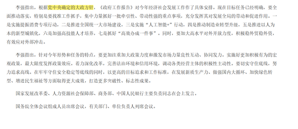 李强指出,根据党中央确定的大政方针,《政府工作报告》对今年经济社会发展工作作了具体安排。