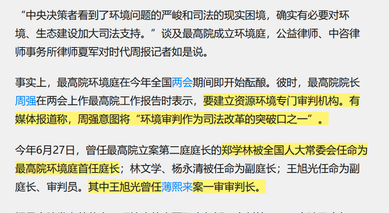 今年6月27日,曾任最高院立案第二庭庭长的郑学林被全国人大常委会任命为最高院环境庭首任庭长;林文学、杨永清被任命为副庭长;王旭光任命为副庭长、审判员。其中王旭光曾任薄熙来案一审审判长。