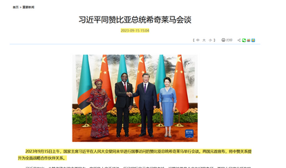 根據外交部公佈,2023年9月15日上午,国家主席习近平在人民大会堂同来华进行国事访问的赞比亚总统希奇莱马举行会谈。会谈前,习近平在人民大会堂东门外广场为希奇莱马举行欢迎仪式。
