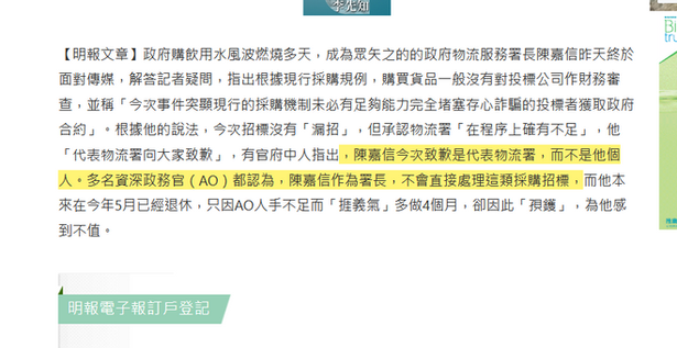 明報一篇文章,內容是多名資深政務官員為陳嘉信發聲。他們說陳嘉信作為署長,不會直接處理這類採購招標。事實上在整個中央投標委員會中,有兩位財庫局亦即是採購部門的官員包括常務秘書長黎志華和副秘書長羅中,另外發展局也是常務秘書長劉俊傑,唯獨是物流處是由處長陳嘉信負責。